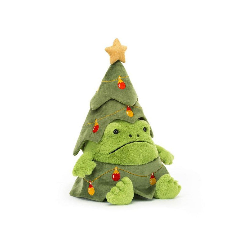 Zabawna Żaba Ricky to wyjątkowo miękki i przyjemny w dotyku pluszak, który z pewnością wywoła uśmiech na twarzy każdego malucha. Posiada zielone futerko, uroczą buźkę, bardzo mięciutki brzuszek oraz urocze płetwy. Żaba ubrana jest w kostium choinki ozdobiony gwiazdką i kolorowymi lampkami, co czyni ją idealną dekoracją świąteczną i świetnym towarzyszem do przytulania. Pluszak został uszyty z najwyższej jakości, trwałych i bezpiecznych dla dzieci materiałów, dzięki czemu sprawdzi się zarówno jako ozdoba, jak i przyjaciel do zabawy.